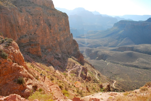 Really hot. So, if you plan to hike the South Kaibab, you need to carry all of your water down with you, along with your food, clothes, sleeping bag etc. So although 7 miles doesn't sound too bad, when it's getting close to 100 degrees, you're in full sun, and you're carrying a 35 pound pack on your back, it can get a little tough. And then there's the elevation change. From the start of the trail to the bottom the canyon goes through a one mile elevation change.